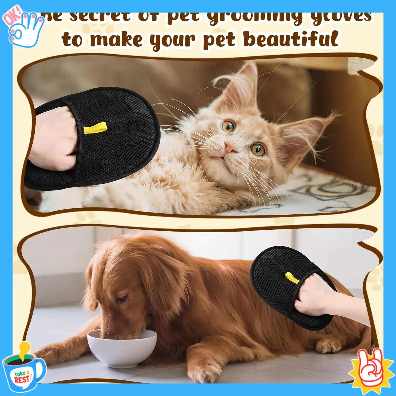 【Comfortable & Pet-Friendly】Crafted from soft,skin-friendly material,these electrostatic pet hair remover gloves provide a soothing experience while effectively removing fur. The flexible fabric massages your pet and bonding during grooming
